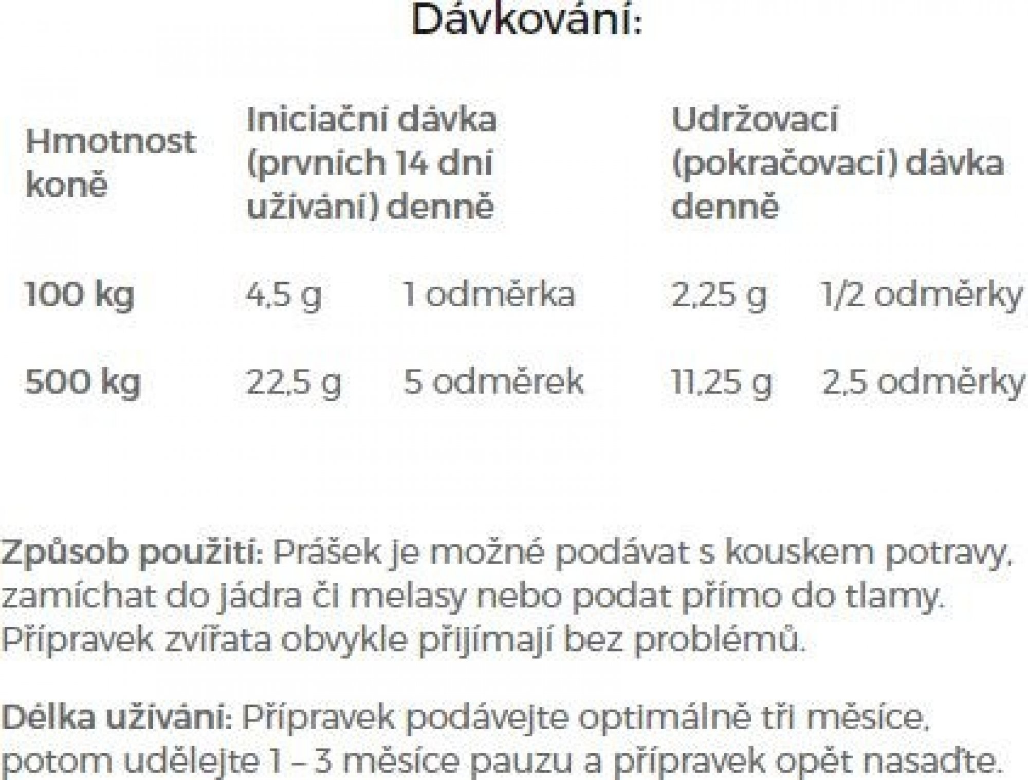 | Hmotnost koně | Iniciační dávka (prvních 14 dní) | Udržovací dávka |