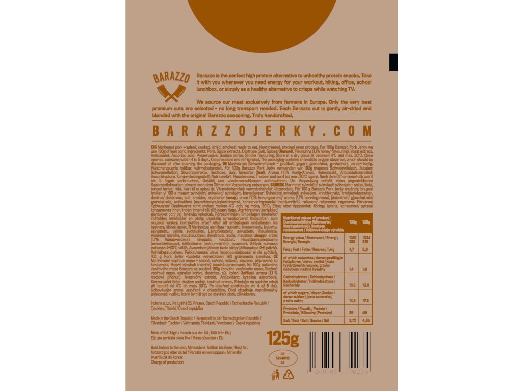 Objevte jedinečný zážitek delikátního sušeného vepřového masa Barazzo! Ručně vybírané prvotřídní kousky vepřového masa, mistrovsky ochucené originální směsí koření Barazzo, nabízí nejen vysoký obsah bílkovin, ale i neuvěřitelnou křehkost, která překonává tradiční sušené hovězí. Nechte se unést jedinečnou chutí a jemností každého kousku, pečlivě vysušeného na vzduchu pro dokonalý zážitek.