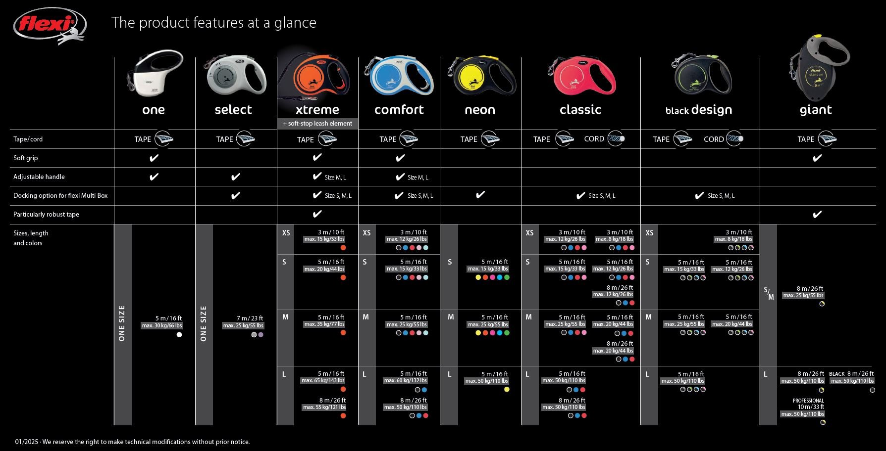 Flexi nabízí několik produktových řad, které se liší designem, úrovní výbavy i cílovou skupinou psů.