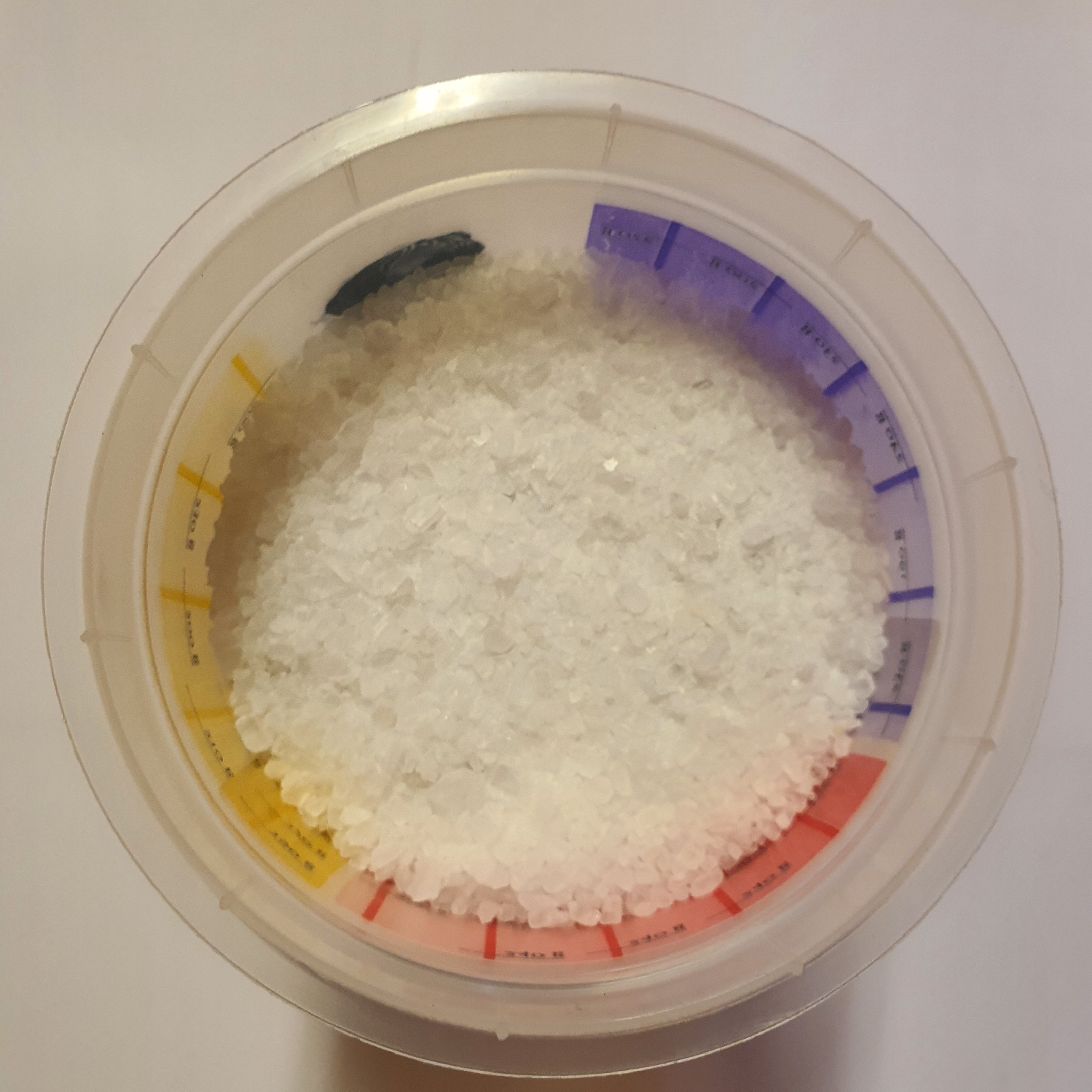 Vzorek hrubosti a čistoty zrn posypové technické soli balené. Tato sůl může obsahovat nečistoty, není balena v potravinářské kvalitě a rozhodně není určena k potravinářských účelům!