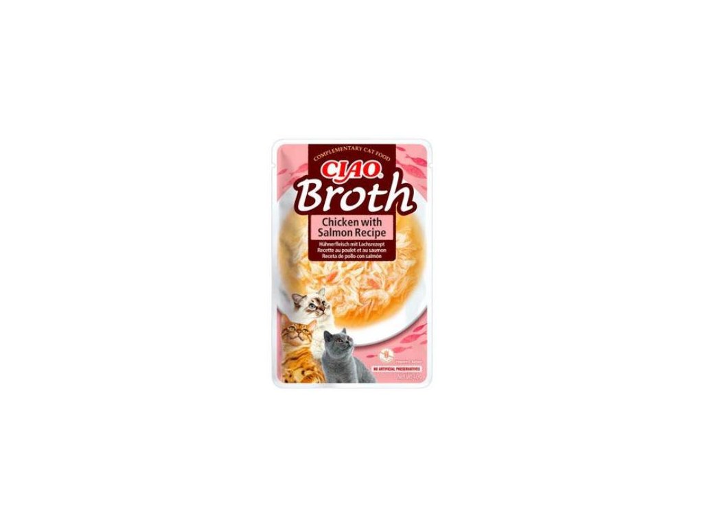 Prémiový pamlsek Churu Broth s natrhaným kuřecím masem a kouskem lososa ve voňavém kuřecím vývaru. Receptura je založena na čerstvých surovinách bez konzervantů, umělých barviv a obilovin. Díky vysokému obsahu vody je vhodným doplňkem stravy, zvláště pro kočky s nižším příjmem tekutin.