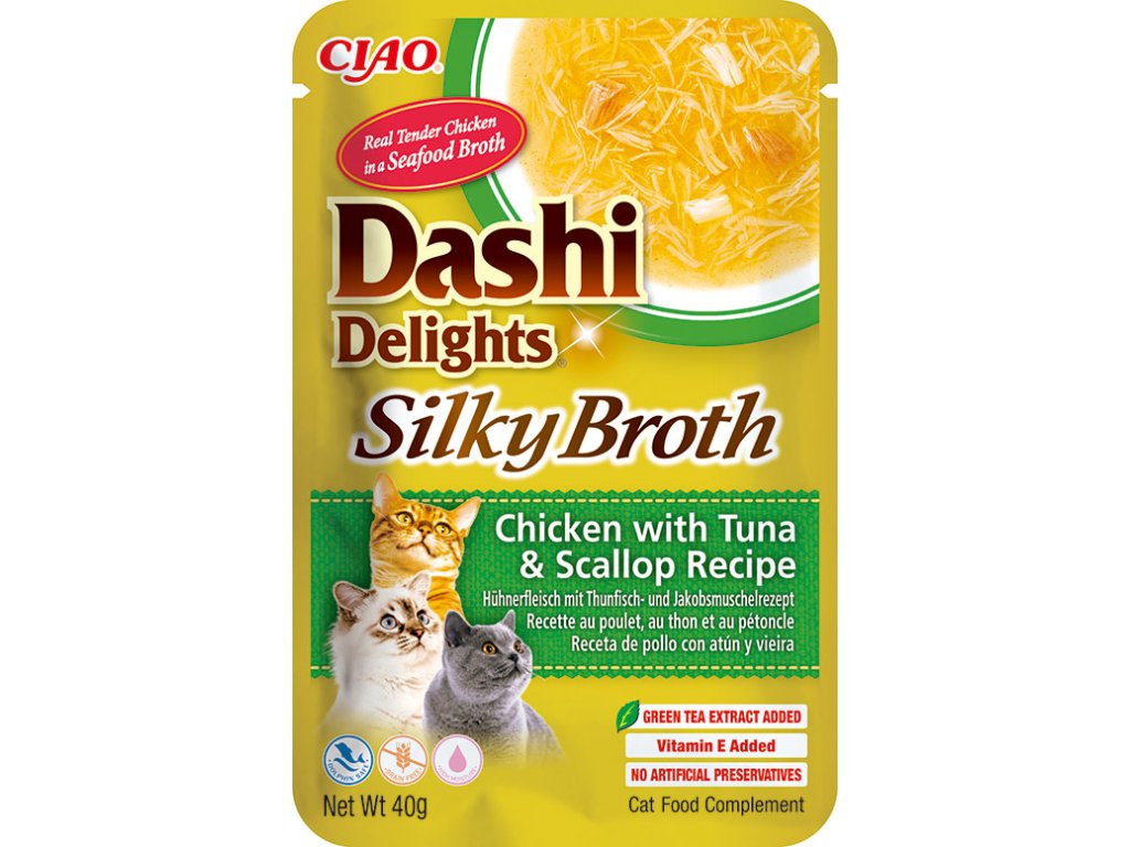 Doplňkové krmivo pro kočky s neodolatelnou kombinací kuřete, tuňáka a lahodné hřebenatky v hedvábném vývaru Dashi, který je vyroben z vloček sušeného tuňáka (bonito). Tento tradiční japonský rybí vývar má nízký obsah tuku a kalorií, ale vyniká silnou chutí, která povzbudí chuť k jídlu i u mlsných koček.
