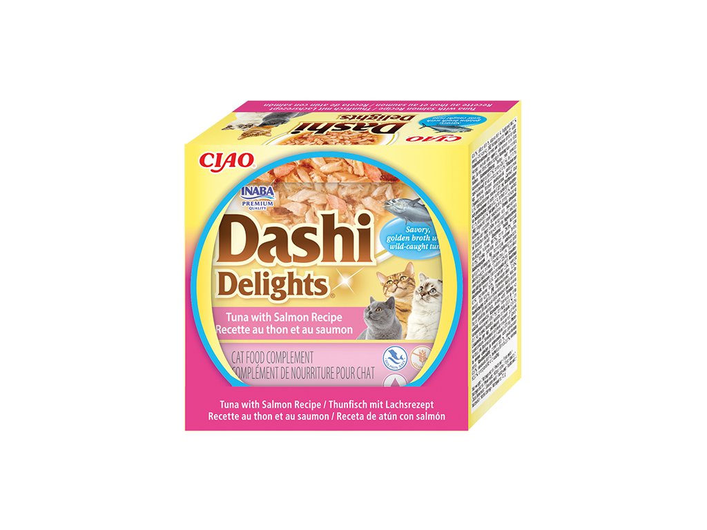 Lahodné doplňkové krmivo pro kočky s pravým mořským tuňákem a šťavnatým lososem v tradičním japonském vývaru Dashi. Tento výživný rybí vývar z tuňákových vloček je proslulý svou jemnou chutí a přirozeným obsahem živin. Receptura je zcela bez kuřecího masa, obilovin, konzervantů a umělých barviv, takže je vhodná i pro citlivé kočky. Díky vysokému obsahu vody pomáhá udržovat správnou hydrataci a podporuje zdraví močových cest.