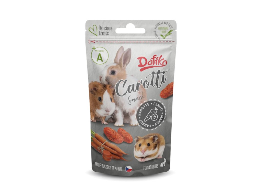 Dafiko Carotti jsou chutná mrkvová dražé, určená jako odměna nebo zpestření běžné denní krmné dávky hlodavců. Díky obsahu sušené mrkve a přidaných vitaminů nejsou jen chuťově atraktivní, ale slouží také jako funkční doplněk stravy.