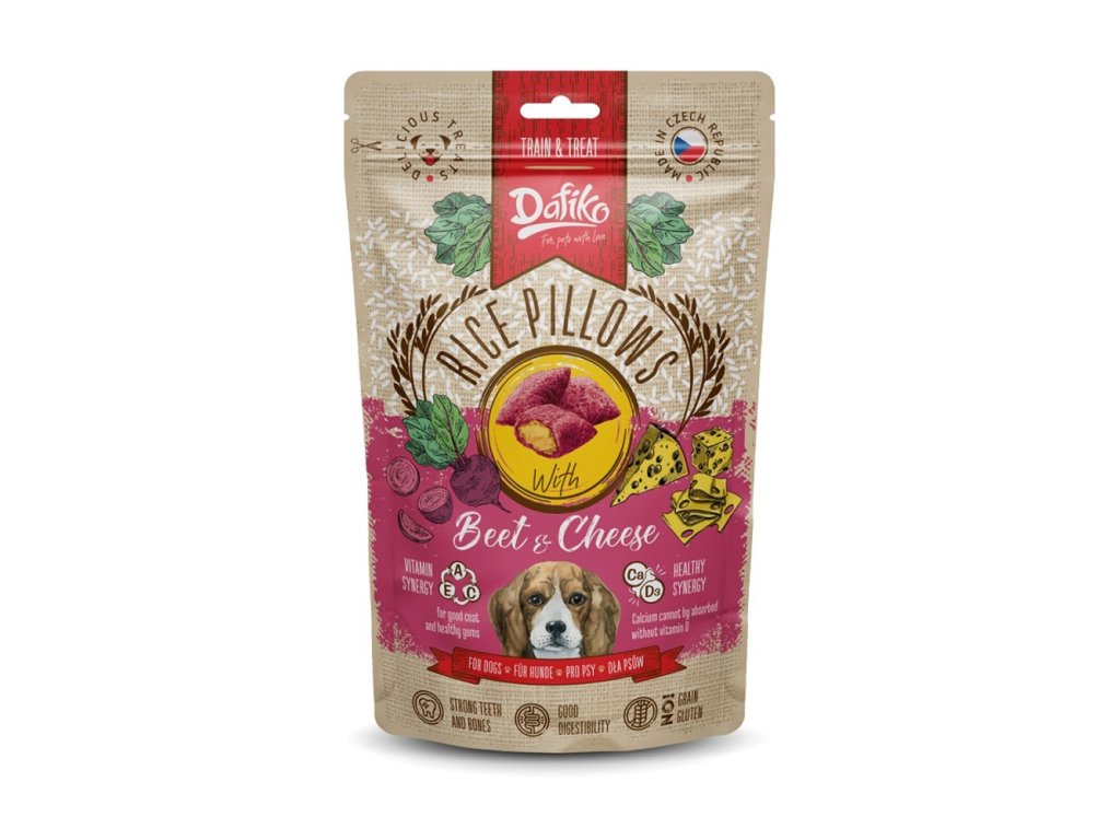 Dafiko plněné polštářky s červenou řepou a sýrem jsou funkčním pamlskem určeným jako doplněk ke kompletní krmné dávce psů. Jsou navrženy pro podporu správného trávení a díky pečlivě zvolenému složení jsou vhodné i pro psy s nadváhou nebo pro psy trpící cukrovkou.