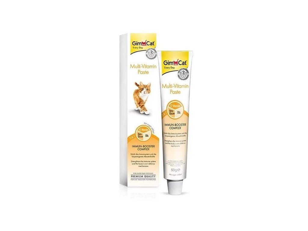 GimCat Multi-Vitamin je chutná multivitaminová pasta s komplexem 3v1 – obsahuje 12 nezbytných vitaminů, betaglukany a biologicky cenné oleje, které společně posilují imunitní systém, zlepšují vitalitu a pomáhají tělu aktivovat přirozené obranné mechanismy.
