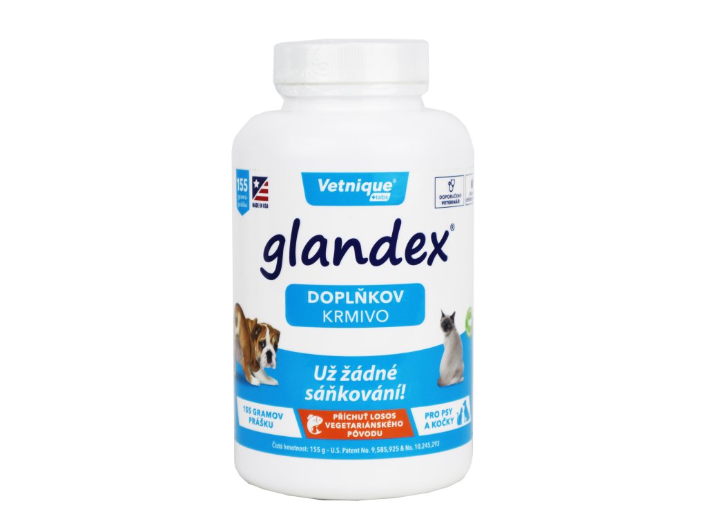 Glandex Powder je funkční doplňkové krmivo pro psy a kočky určené k dlouhodobé podpoře správné funkce análních žlázek. Díky kombinaci přírodní vlákniny, trávicích enzymů, protizánětlivých látek a probiotik pomáhá formovat stolici, podporuje zdravé trávení a přispívá ke snížení potřeby manuálního vymačkávání žlázek. Prášková forma s lososovou příchutí je vhodná zejména pro kočky a psy, včetně velkých plemen, a snadno se přimíchává do krmiva.