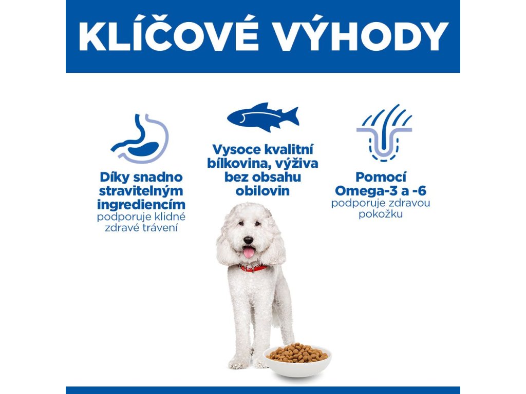 Receptura byla vyvinuta pro psy trpící přecitlivělostí na krmivo nebo potravní alergií – obsahuje omezený počet vysoce kvalitních bílkovin, bez obilovin a je snadno stravitelná.
