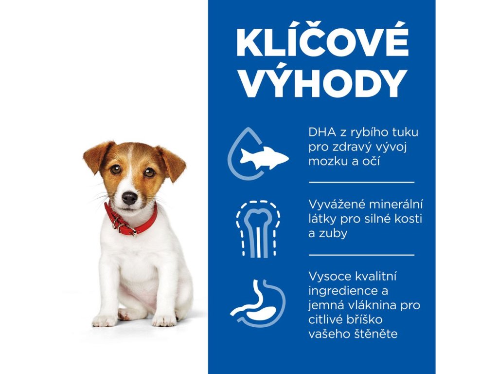 Malé tělo, velké nároky. Hill's Science Plan Puppy Small & Mini Chicken bylo vyvinuto na míru potřebám štěňat malých plemen do 1 roku věku. Obsahuje vyvážený poměr živin, kvalitních bílkovin, minerálů a antioxidantů, které pomáhají štěněti vyrůst zdravě, silně a spokojeně.
