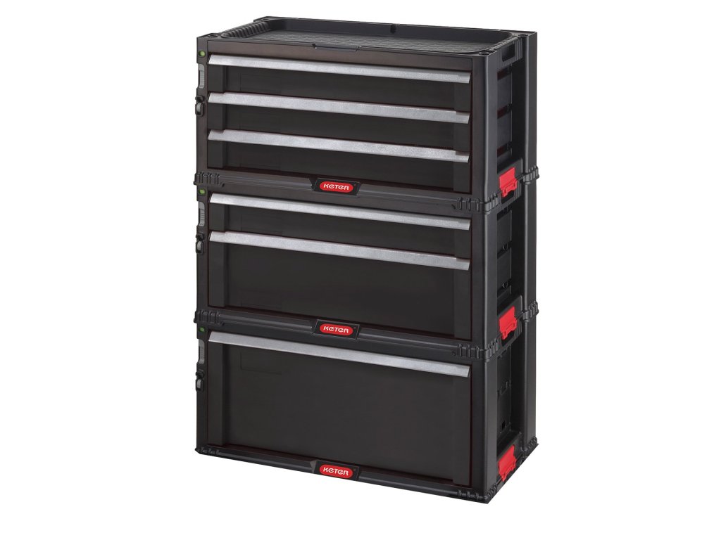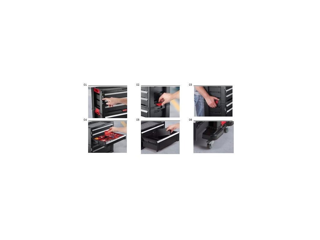 Dodejte své garáži elegantní vzhled bez kompromisů. Zásuvkový systém je ideálním modulárním řešením, které vám umožní přidávat, odebírat a vytvářet mobilní úložný prostor, který nejlépe vyhovuje vašim potřebám při práci. Výrobek disponuje 6 objemnými zásuvkami, což umožňuje praktické seskupování předmětů. Hlubokou zásuvku využijete na uložení většího nářadí.
