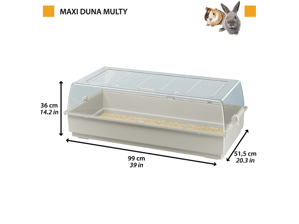 DUNA MAXI MULTY je mimořádně prostorná plastová klec, která poskytne ideální zázemí křečkům, morčatům i králíkům. Díky průhledné plastové střeše s odklápěcí kovovou mřížkou je zajištěna skvělá viditelnost i cirkulace vzduchu. Její rozměry téměř jeden metr na délku zaručují dostatek prostoru pro pohyb a pohodlné vybavení.