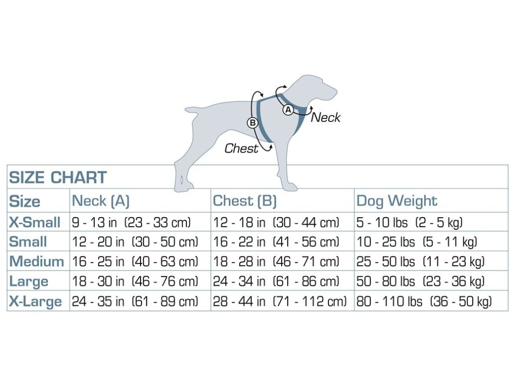 Před výběrem velikosti změřte obvod krku a hrudníku. Postroj by měl dobře přiléhat, ale neměl by psa omezovat v pohybu.