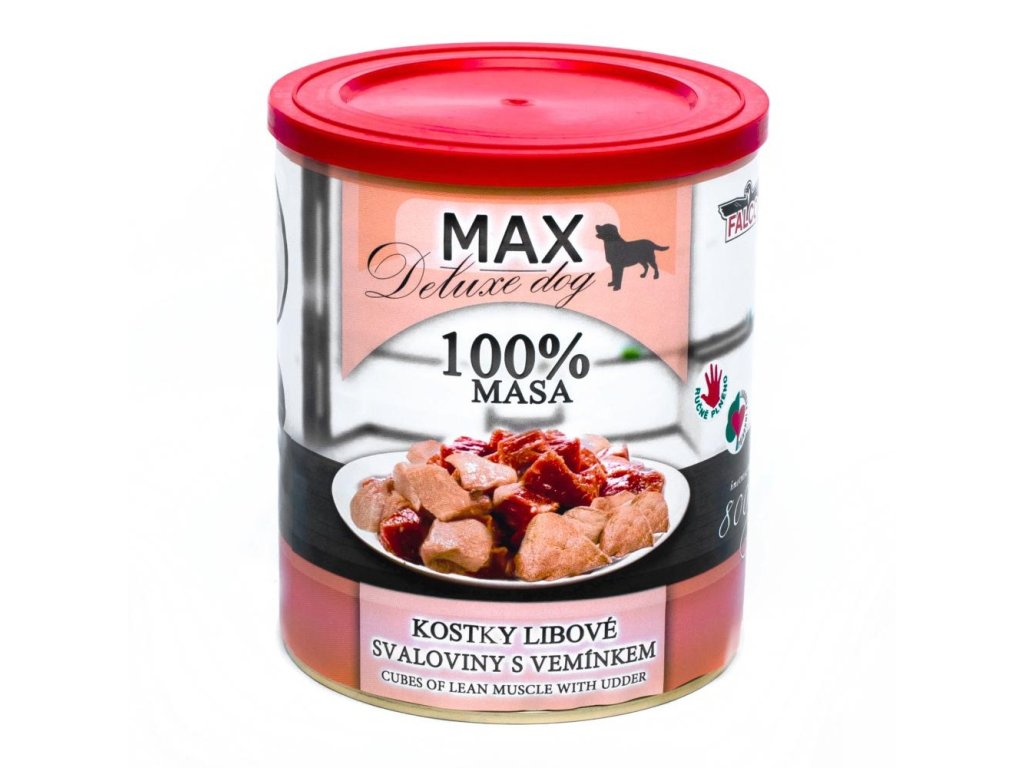 Konzervy MAX Deluxe představují řadu masových produktů pro psy vyrobených z celých kusů masa. Receptury jsou založeny na vysokém podílu živočišných surovin a neobsahují žádné přidané chemické konzervanty, barviva ani aromata. Konzervy jsou vhodné pro psy všech plemen a věkových kategorií. Obsahuje celé kusy masa, obsahuje různé druhy svaloviny podle konkrétní varianty, bez obilovin, bez rýže, bez sóji, bez chemických konzervantů, barviv a aromat, kosti jsou díky sterilizaci měkké a bezpečné. Vhodné pro psy všech velikostí a věkových kategorií, včetně psů v zátěži, březích a kojících fen