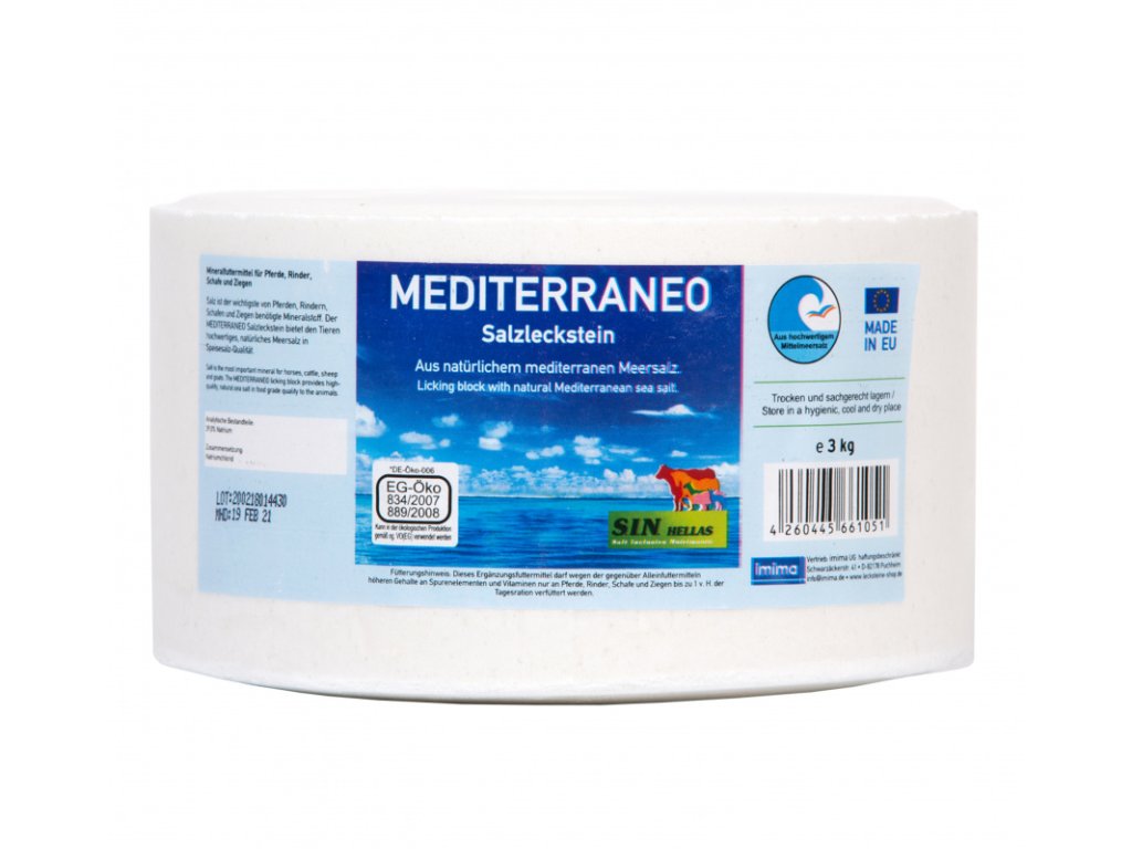 Mořská sůl použitá pro lizy MEDITERRANEO je získávána výhradně v EU a splňuje vysoké evropské požadavky na kvalitu, ekologii a sociální odpovědnost. Produkt je součástí nabídky minerálních lizů značky SIN Hellas.