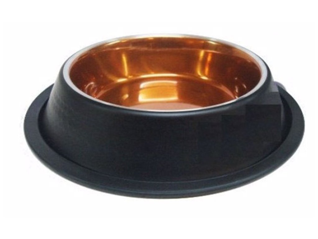 Elegantní nerezová miska s netradičním designem – vnější povrch v matně černé barvě a vnitřek v lesklém měděném odstínu dodají krmnému místu vašeho mazlíčka luxusní vzhled.