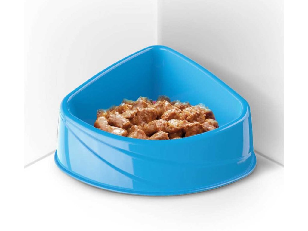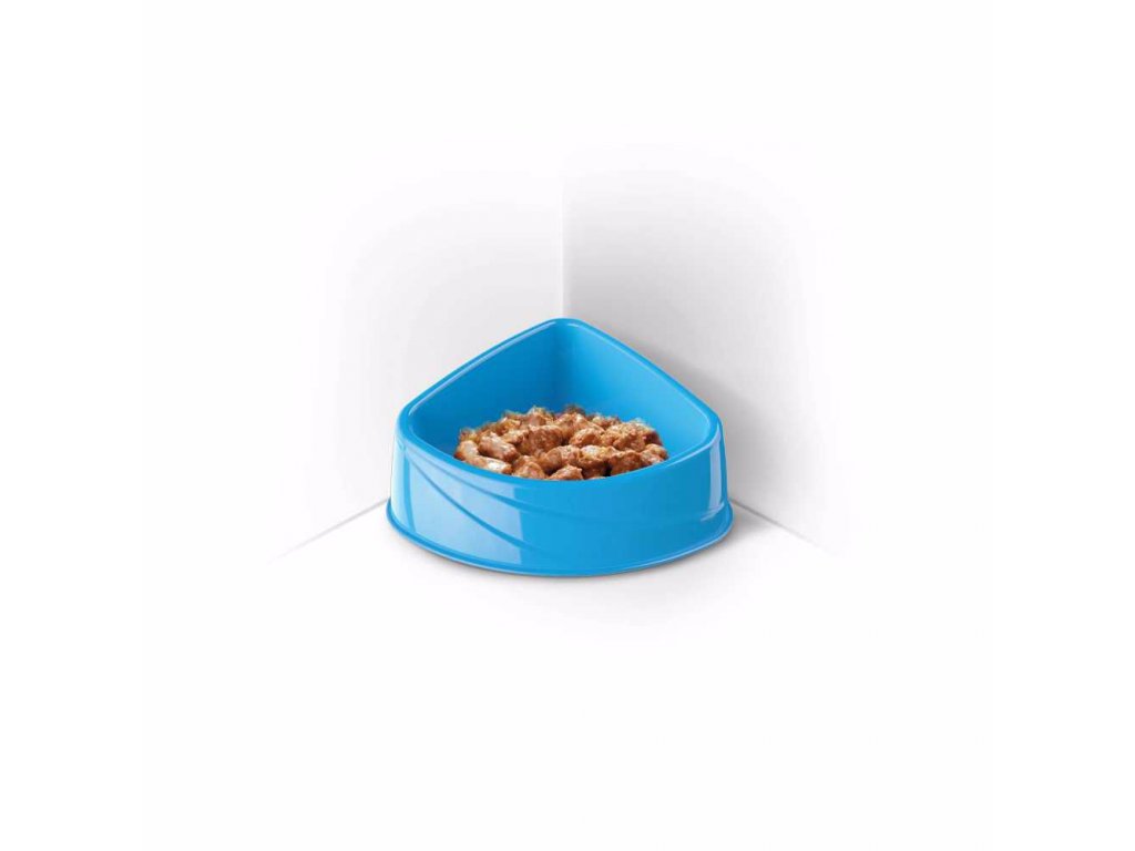 Elegantní rohová plastová miska navržená pro úsporu prostoru, aniž by byla omezena dostupnost pro zvíře. Vhodná na vodu i krmivo pro psy a kočky.
