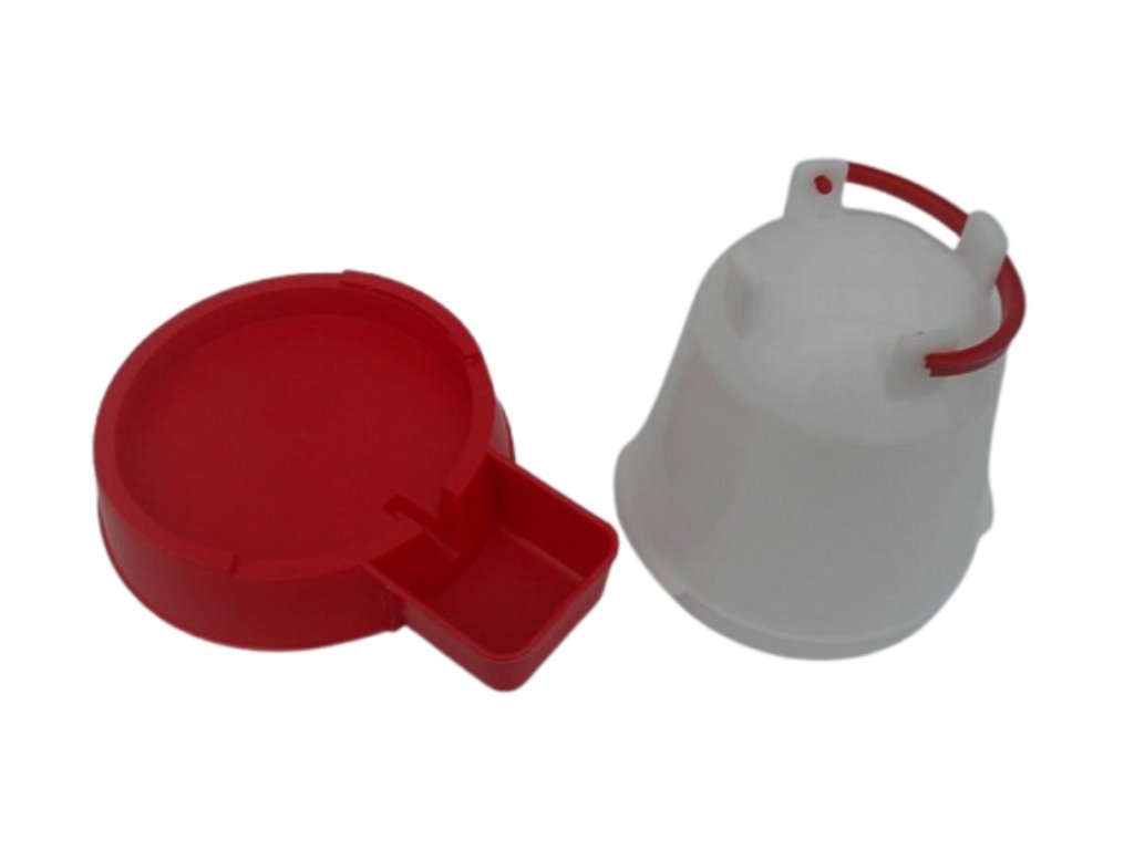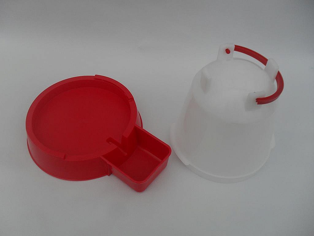 Plastová dvoudílná napáječka s ručkou a miskou, určená pro malou drůbež k napájení.