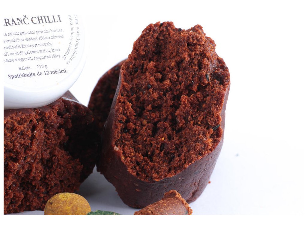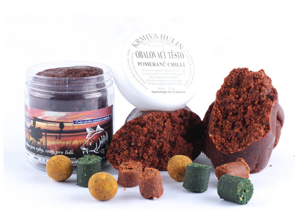 - Tip na použití: Obalovací těsto Pomeranč a chilli je možné použít na zatraktivnění povrchu boilies, či pelet a urychlit si vnadící efekt a zároveň prodloužit životnost nástrahy. Je ho možné použít i na háček jako nástrahu, nebo na obalení krmícího olůvka " Pasta ". Těsto, díky svému složení, vytvoří ve vodě gelovou vrstvu, která změkne a vypouští rozpustné látky. Těsto nanášejte na suché boilies, nebo pelety, aby dobře přilnulo.