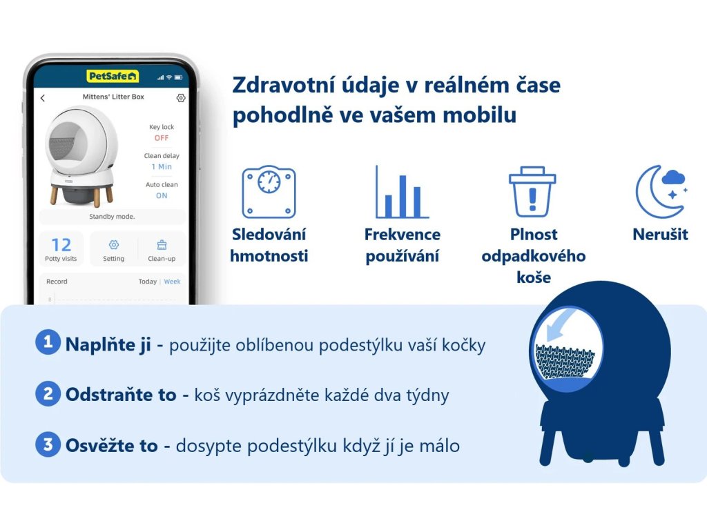 Rozlučte se s každodenním čištěním kočičí toalety! Automatická PetSafe® ScoopFree SmartSpin™ přináší revoluční způsob, jak udržet podestýlku čistou a váš domov bez zápachu. Díky chytré technologii a propojení s mobilní aplikací můžete v reálném čase sledovat zdravotní údaje vaší kočky, jako je hmotnost nebo frekvence používání toalety.