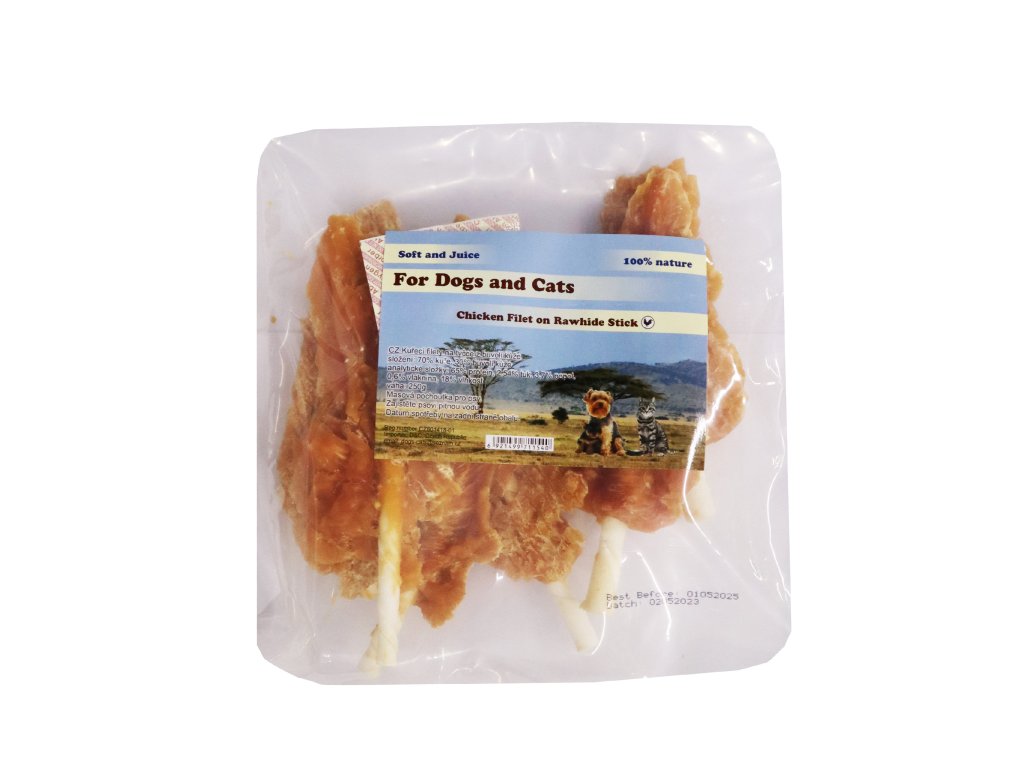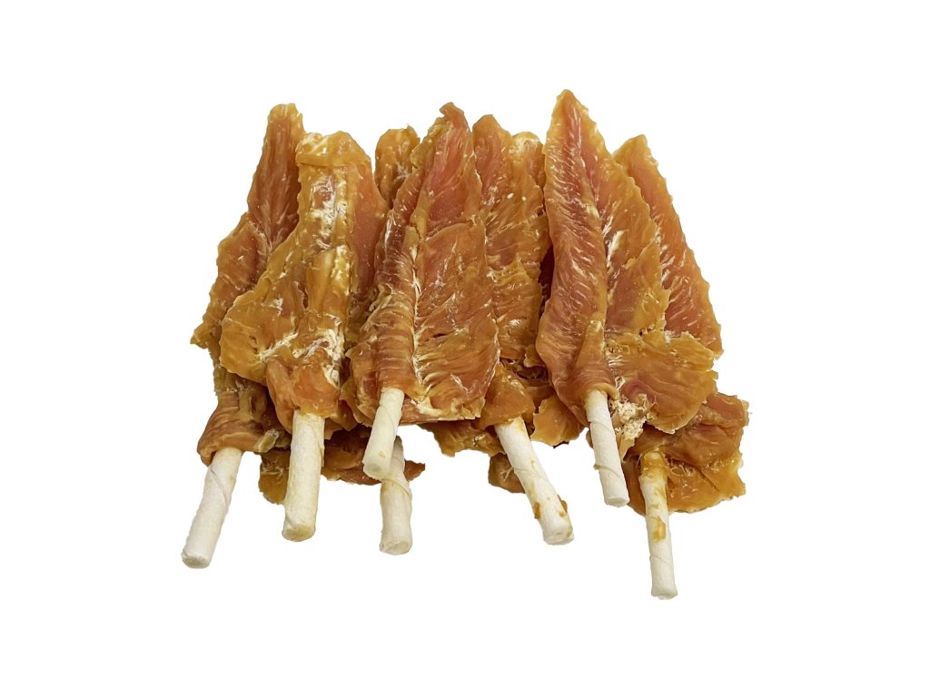Kuřecí filety na tyčce z buvolí kůže – žvýkací pochoutka pro psy a kočky všech plemen.