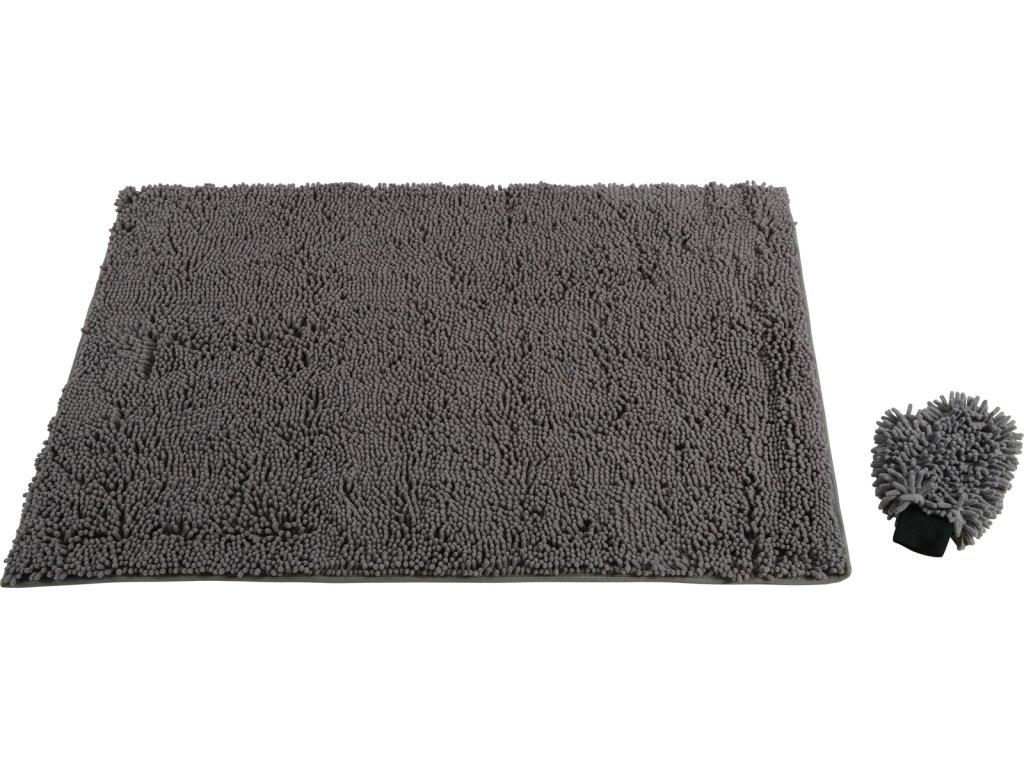 Praktická sada podložky a rukavice z rychleschnoucího mikrovlákna pro snadné osušení psa po koupeli, plavání nebo návratu z deštivé procházky. Velký formát podložky je vhodný i pro střední a větší psy.