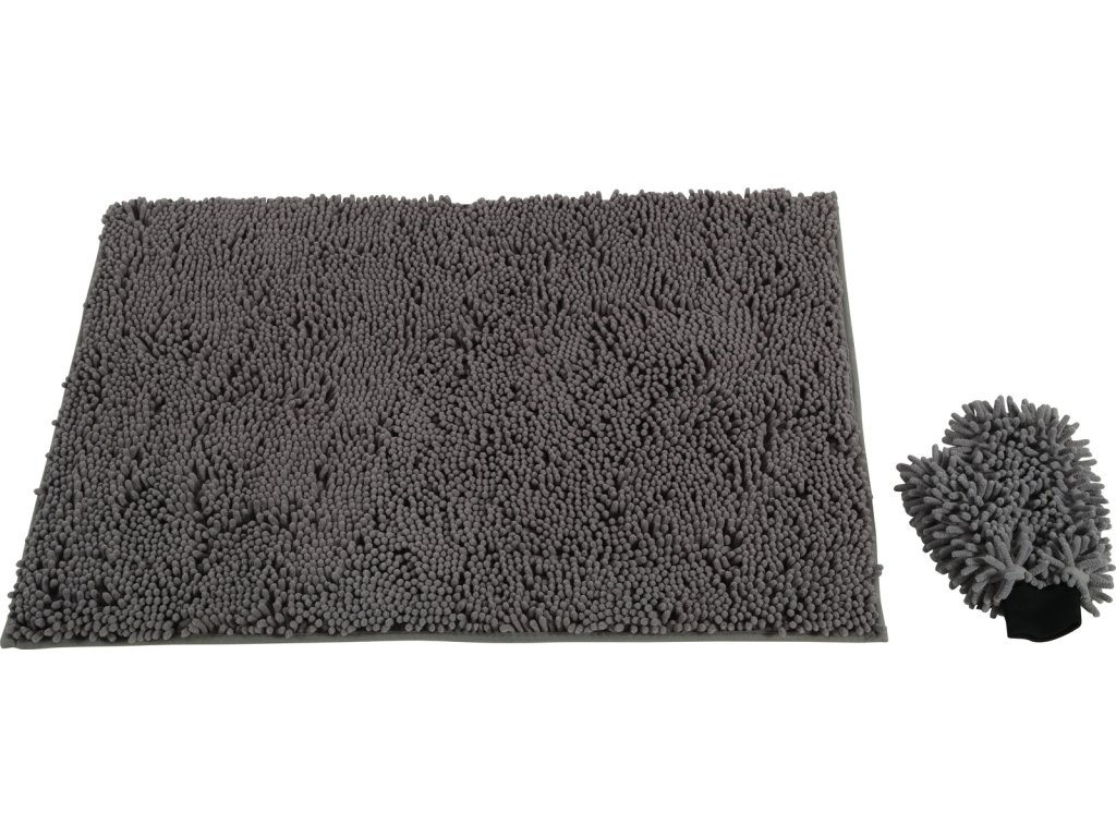 Praktická sada podložky a rukavice z rychleschnoucího mikrovlákna pro rychlé a efektivní osušení psa po koupeli, plavání nebo návratu z deštivé procházky. Rozměr 90 × 60 cm je vhodný především pro menší a střední psy.