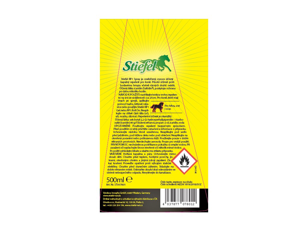 Produkt Stiefel RP1 Insect-Stop Gel 500 ml je v České republice schválen jako biocidní přípravek pod číslem 16/2018, nikoliv jako veterinární léčivý přípravek. Držitelem rozhodnutí o schválení a výhradním distributorem v ČR je společnost Ghoda s.r.o., Husinecká 10, 130 00 Praha 3.