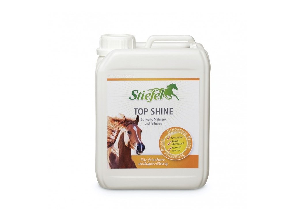 Stiefel Top Shine je osvědčený lesk a rozčesávač pro každodenní i profesionální péči o koně. Usnadňuje kartáčování srsti, hřívy i ocasu, pomáhá rozčesat zacuchané žíně a výrazně zlepšuje celkový vzhled koně.
