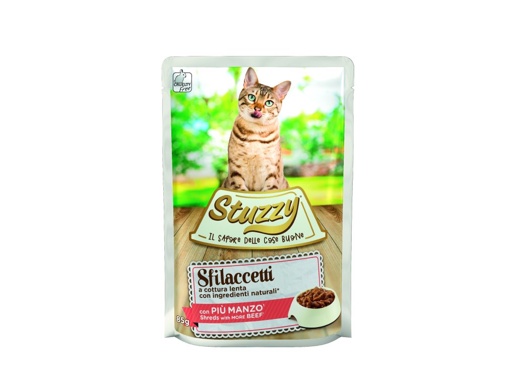 Italská značka Stuzzy s označením Sfilaccetti znamená, že kapsička obsahuje jemně natrhané maso z přírodních surovin, připravované metodou pomalého dušení, což zajišťuje vyšší chutnost a lepší stravitelnost.