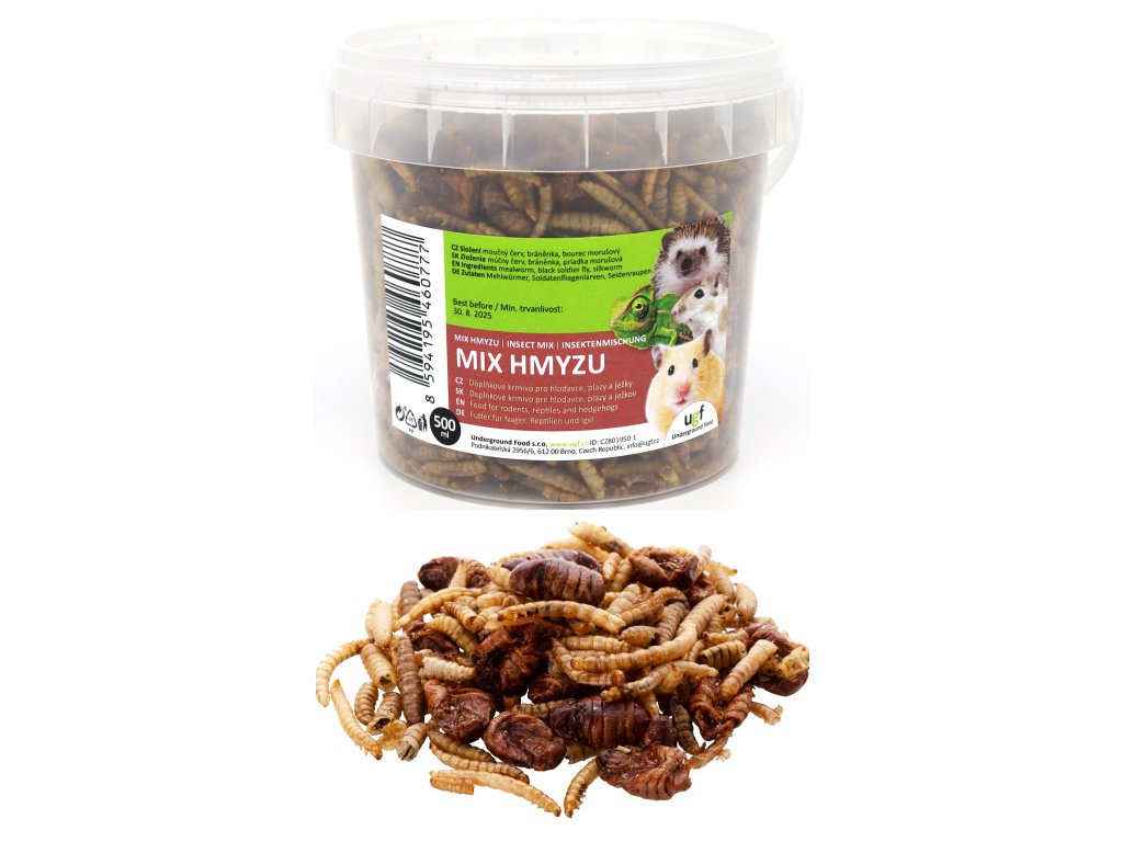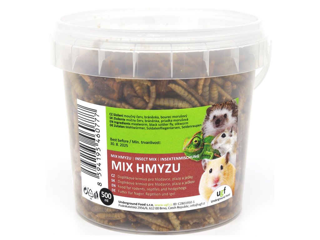 UGF Mix hmyzu je 100% přírodní doplňkové krmivo vhodné pro hmyzožravé hlodavce, plazy a ježky. Obsahuje vyváženou směs moučných červů, larev bráněnky a bource morušového, které jsou cenným zdrojem bílkovin, tuků i probiotické vlákniny.