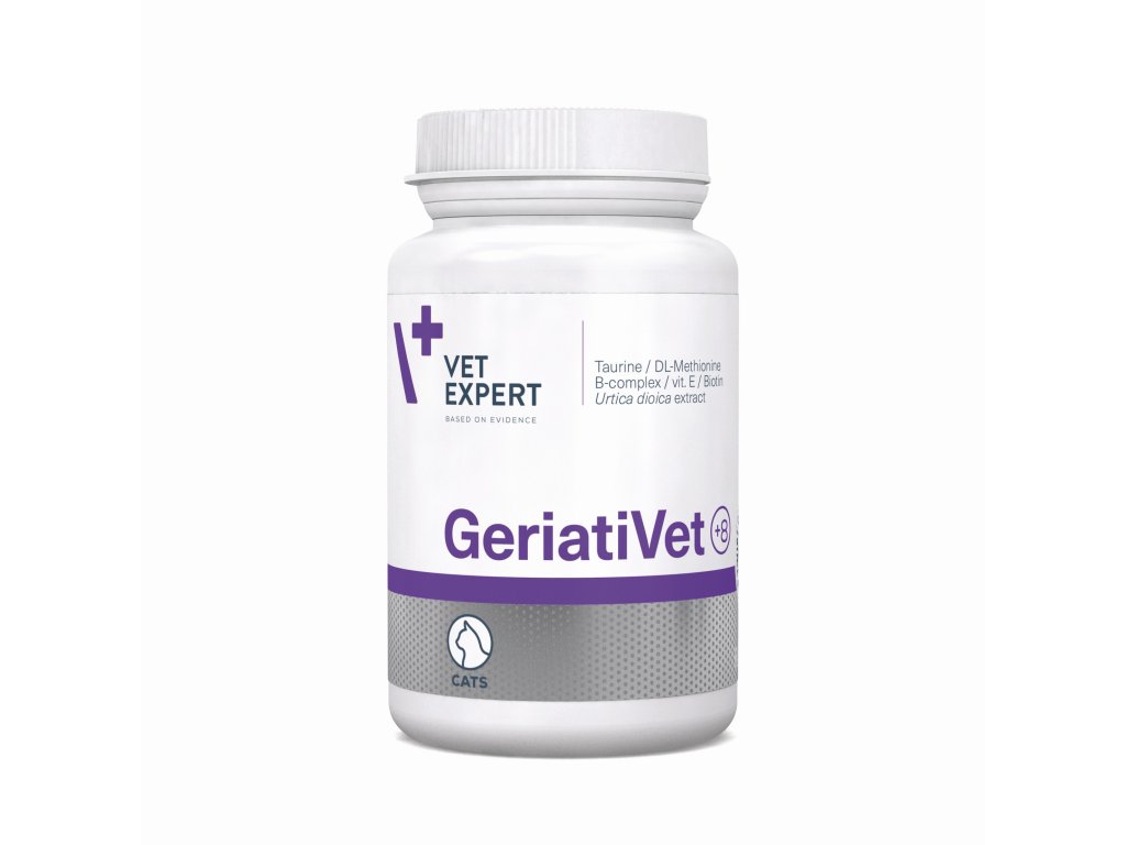 VetExpert GeriatiVet Cat je komplexní doplněk výživy určený speciálně pro seniorské kočky. Jeho vyvážené složení podporuje činnost srdce, nervového systému, trávení i funkci močových cest, zatímco antioxidanty pomáhají chránit organismus před stárnutím a volnými radikály.