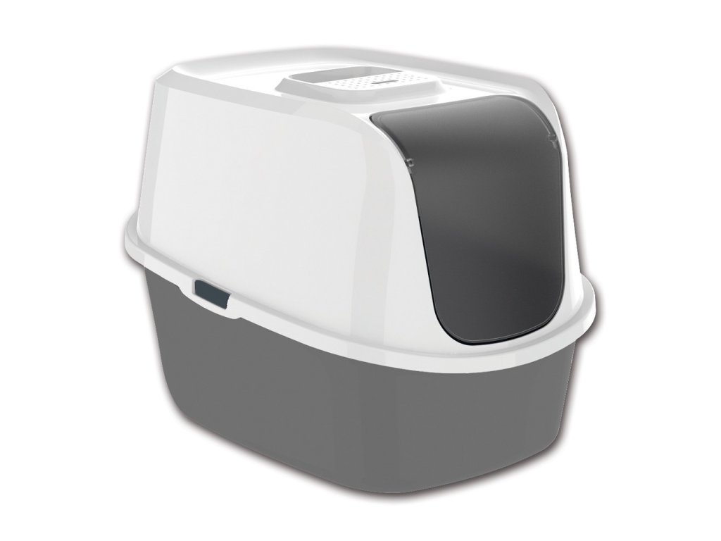 Uzavřené, prostorné wc pro kočky s horním průlezem z kvalitního odolného plastu.