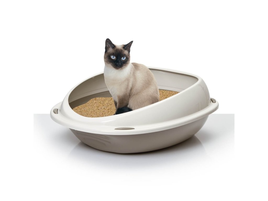 Moderní otevřená toaleta pro kočky s funkčním oválným designem a vysokým zakřiveným okrajem, který zajišťuje, že stelivo ani moč neproniknou ven z boxu. Díky tomu zůstává podlaha kolem toalety vždy čistá.
