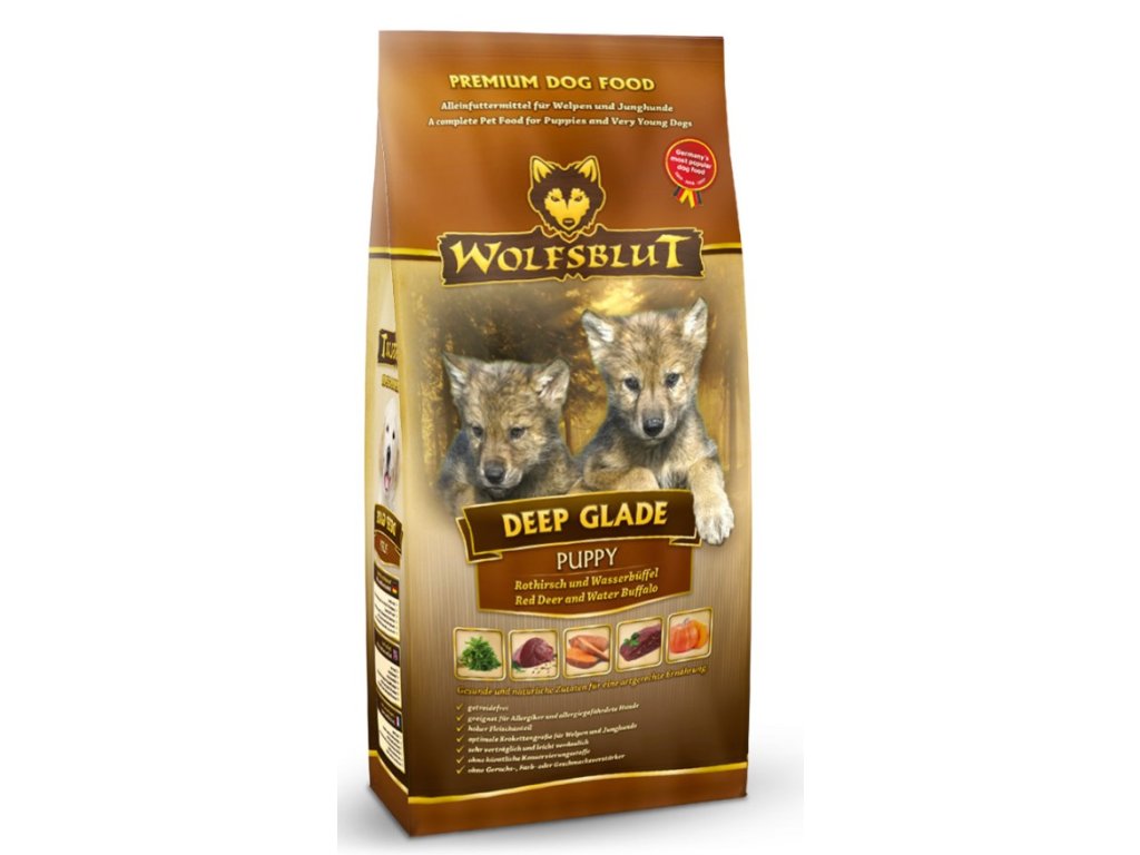 Vlci loví svou kořist od Skalistých hor Severní Ameriky, arktické tundry, hor a lesů Evropy až po pouště a stepi střední Asie. To jim dodává maso a vnitřnosti bohaté na živiny, ale také zeleninu, ovoce, bobule, kořeny a bylinky z obsahu žaludku kořisti. Obilí zde není zahrnuto. Vlk tak přijímá potřebné vitamíny, minerály, stopové prvky, enzymy a druhotné rostlinné látky. Vzhledem k tomu, že vlk je předkem všech psů, naše suché krmivo pro psy Wolfsblut je založeno na přirozených stravovacích návycích vlka. Obsahuje hodně masa nebo ryb v kombinaci se superpotravinami, které obsahují hodnotné ingredience – stejně jako v přírodě, bez obilovin. Náš výběr výjimečných druhů masa a superpotravin bohatých na živiny vychází z vlčích biotopů a jejich pestré stravy. Wolfsblut nabízí každému psovi druhově vhodnou a originální stravu a díky rozmanitosti odrůd si každý najde něco, co snese. Receptura suchého krmiva DEEP GLADE PUPPY kombinuje výživu vlků s nejnovějšími vědeckými poznatky o správné výživě psů.