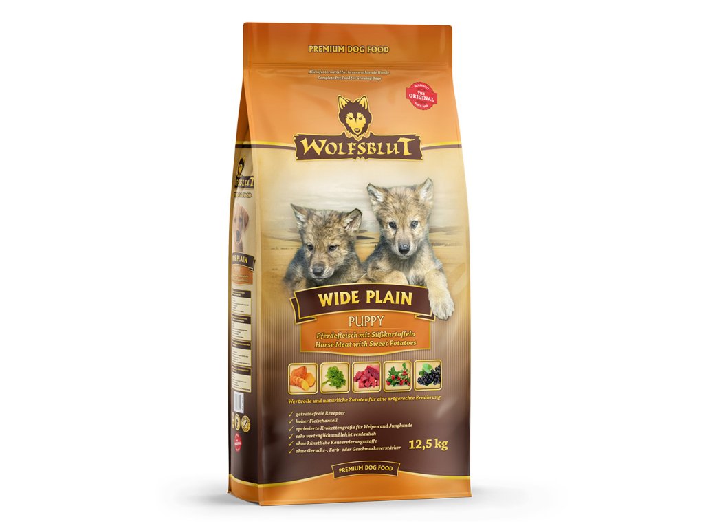 Vlci loví svou kořist ve Skalistých horách Severní Ameriky, arktické tundře, v horách a lesích Evropy a dokonce i v pouštích a stepích střední Asie. To jim poskytuje maso a vnitřnosti bohaté na živiny, ale také zeleninu, ovoce, bobule, kořeny a bylinky prostřednictvím obsahu žaludku kořisti. Obilí zde není zahrnuto. Vlk tak dostává potřebné vitamíny, minerály, stopové prvky, enzymy a druhotné rostlinné látky. Vzhledem k tomu, že vlk je předkem všech psů, naše suché krmivo pro psy Wolfsblut je založeno na přirozených stravovacích návycích vlka. Obsahuje hodně masa nebo ryb v kombinaci se superpotravinami, které obsahují hodnotné ingredience – stejně jako v přírodě, bez obilovin. Náš výběr výjimečných mas a superpotravin bohatých na živiny je založen na vlčím prostředí a jeho rozmanité stravě. Wolfsblut nabízí každému psovi druhově vhodnou a přirozenou stravu a díky rozmanitosti odrůd si každý něco toleruje. Receptura na suché krmivo WIDE PLAIN PUPPY kombinuje stravu vlka s nejnovějšími vědeckými poznatky o správné výživě psů.