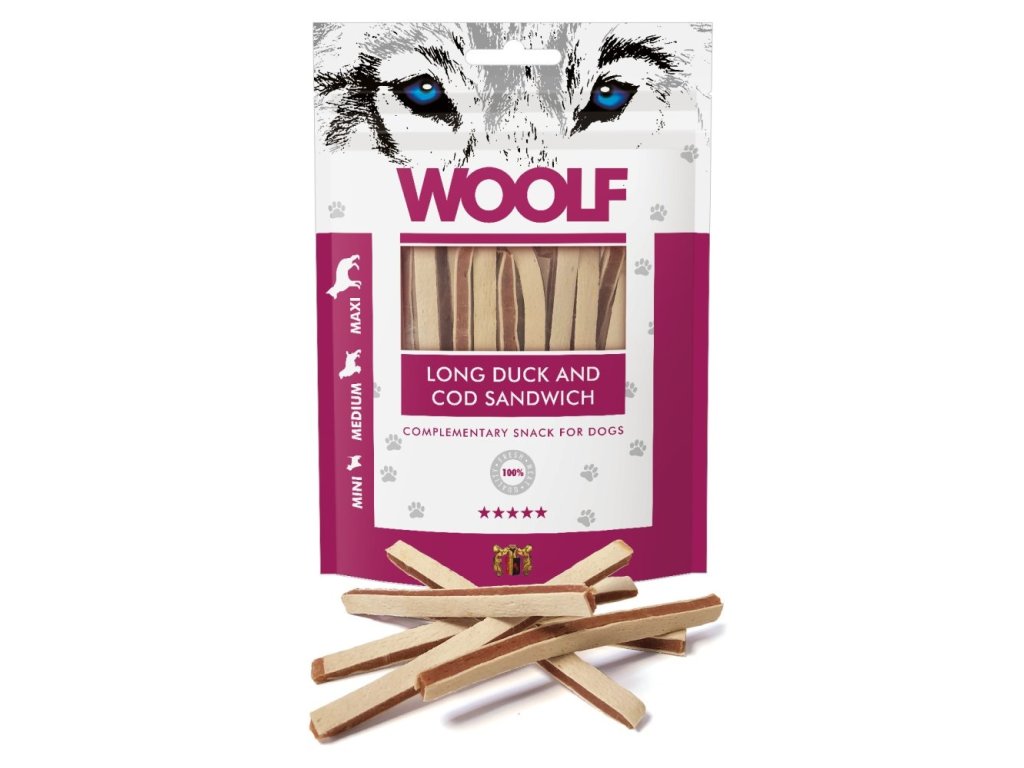 🐕 WOOLF pochoutka Soft Duck and Cod Sandwich Long 100g