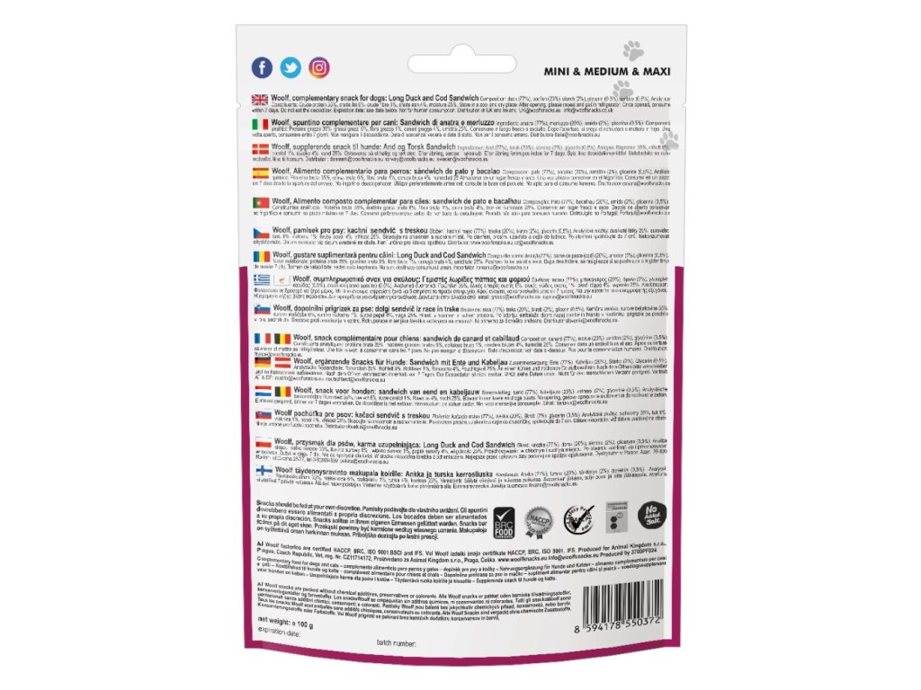 WOOLF pamlsky jsou vyrobeny ze 100% přírodních surovin – kachna (77 %) a treska (20 %). Neobsahují konzervanty, umělá barviva ani dochucovadla. Pro zachování čerstvosti je v balení absorbér kyslíku a uzavíratelný zip.