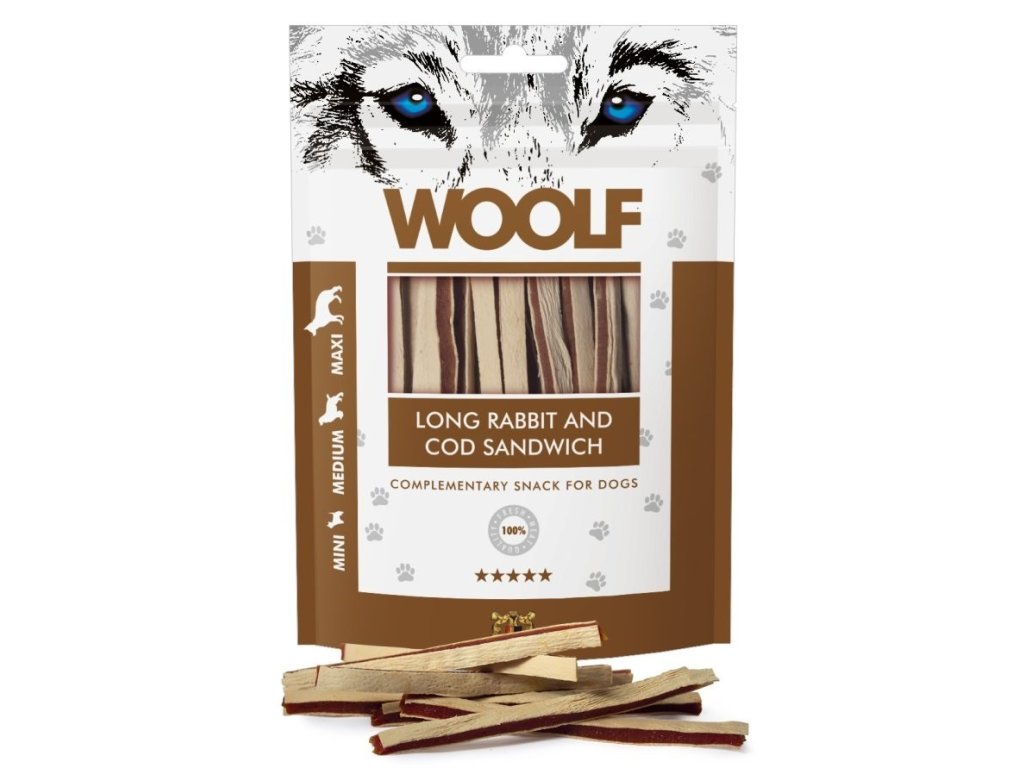 🐕 WOOLF pochoutka Soft Rabbit & Cod Sandwich Long 100g
